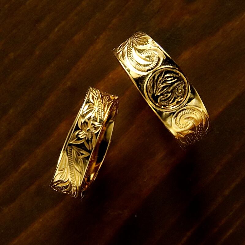 伝統的なハワイアンジュエリーのデザインを取り込んだ24金コーティングリング。ステンレス素材とは思えない精密な彫刻に魅了される1品。